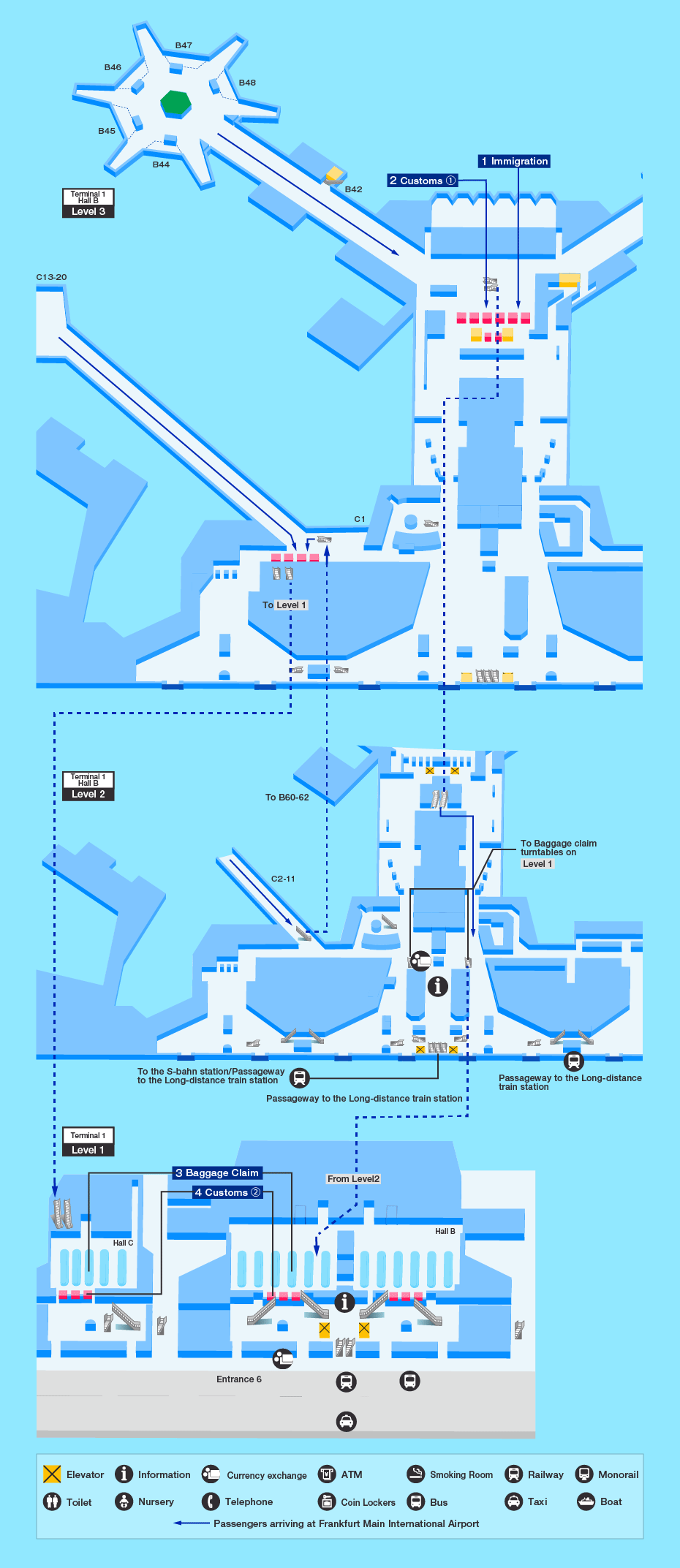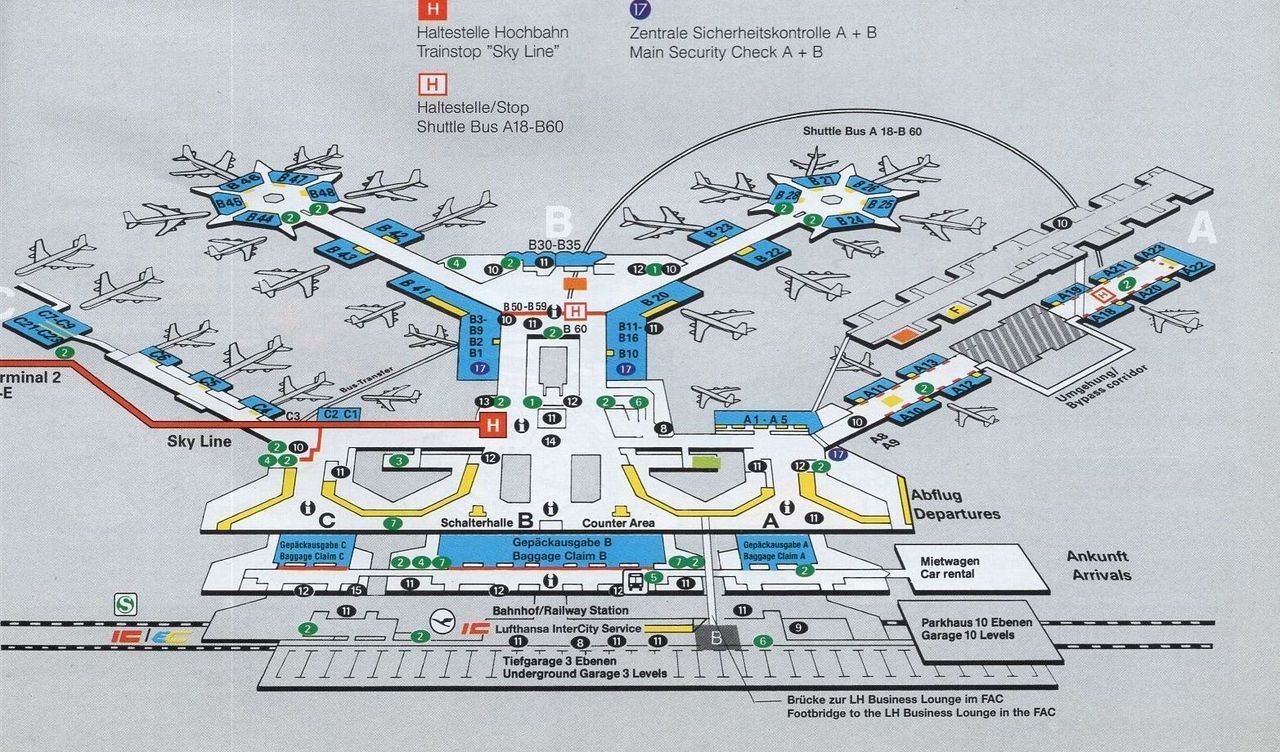Từ chỗ check-in đến cửa ra máy bay: Nếu bạn gặp khó khăn khi đi bộ thì nên yêu cầu hỗ trợ cho các phòng chờ khởi hành. Có thể phải đi bộ cả cây số đến cửa ra máy bay.Hầu hết các sân bay lớn có một kết nối đến Frankfurt.Không phải tất cả máy bay đỗ sát cổng vào nhà ga và bạn sẽ thường xuyên phải đi xe buýt giữa máy bay và nhà ga. Đôi khi các chuyến bay gần kết nối bạn sẽ có một chiếc xe buýt khác nhau từ các nơi đỗ.
