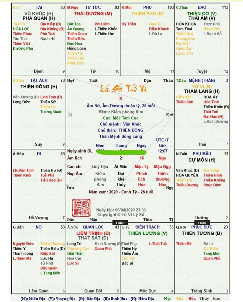 - 2 củ nữa cho 1 câu hỏi vận hạn nhé. Nữ hiệp này có cách cục quả là lời như đồn. Năm ngoái Thái Tuế lại vừa khéo đi lên Đại vận Quý Hợi dẫn động Tướng Tuần, Cô Tang Mã, Vũ Phá Lộc Kiếp Không, gia tăng thêm lực xung sát lên cách cục ở Mệnh gốc. Cái này gọi là "Kim nhân ngộ Khảm mệnh tu thương" vậy. Trong khi LN Tiểu Vận lại đi lên Tị cung cho nên sẽ khó tránh được việc ôm 1 đống nợ đi trốn. Tới đầu năm nay thì sẽ được cứu. Nhưng Bần giả e rằng cuối năm nay thì nữ hiệp này lại nổi lên 1 trận ba đào.